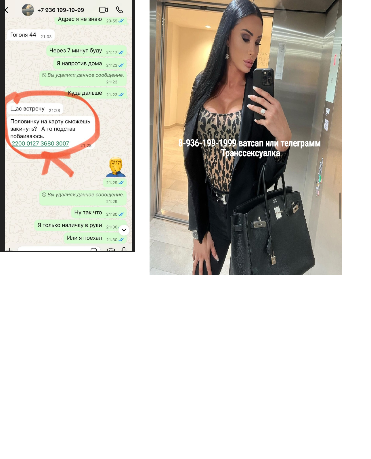 ТРАНССЕКСУАЛКА БЕЗ ПРЕДОПЛАТ ФОТО МОИ Достойно, красиво, все на высшем уровне! Изощренный секс, о котором можно только мечтать. Устрою максимально яркий и незабываемый релакс!!! Реализую все твои смелые фантазии... Новичку открою мир наслаждений, Также могу приехать к вам! Конфиденциально! БЕЗ ПРЕДОПЛАТ есть ватсап и телеграмм @viktoriacononovich 89361991999